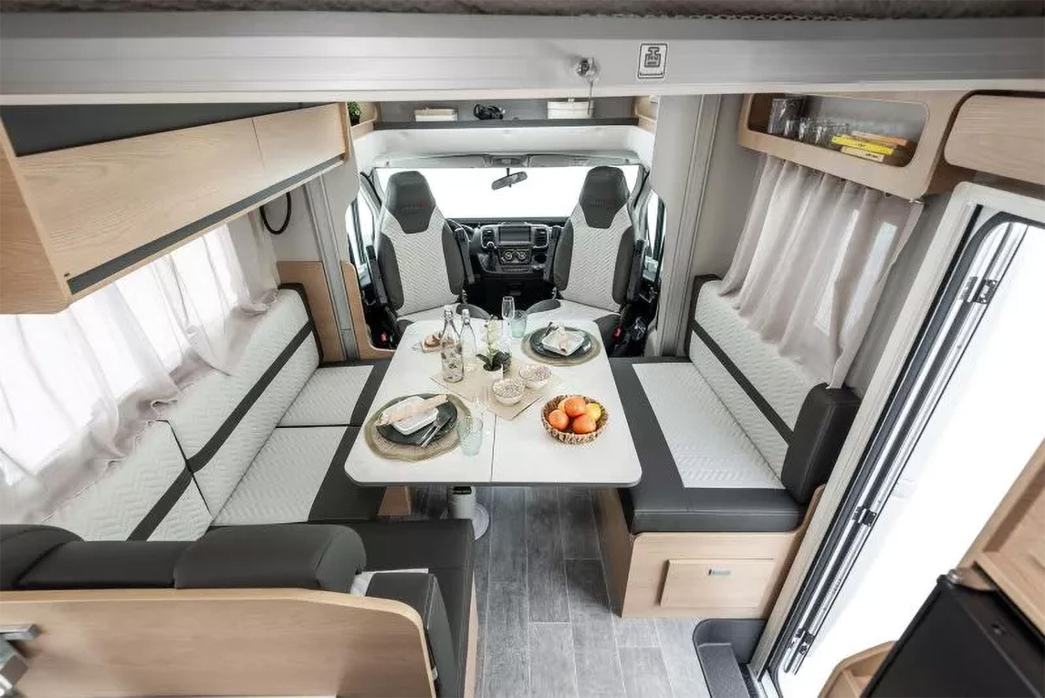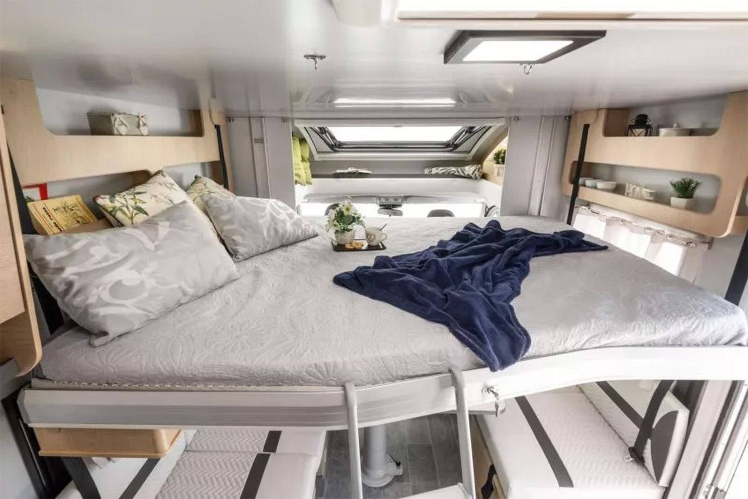 Su interior se caracteriza principalmente por no disponer de cama fija, permitiendo así aprovechar al máximo el espacio del habitáculo durante nuestras estancias. La cama principal se encuentra integrada en el techo, sobre la zona del salón, fácilmente abatible y de grandes dimensiones.