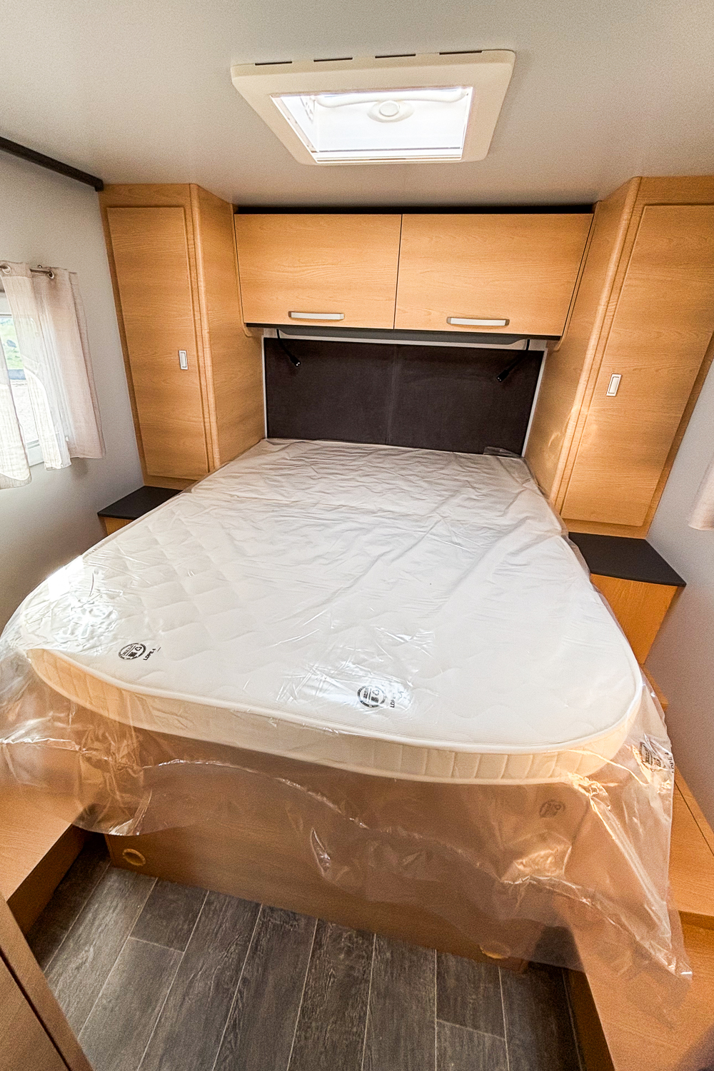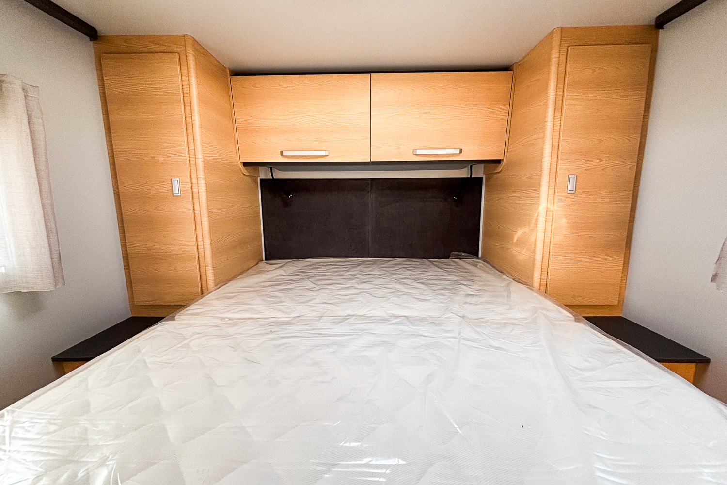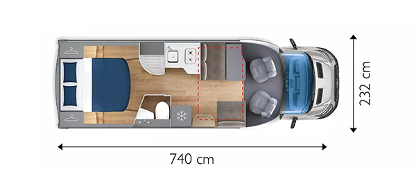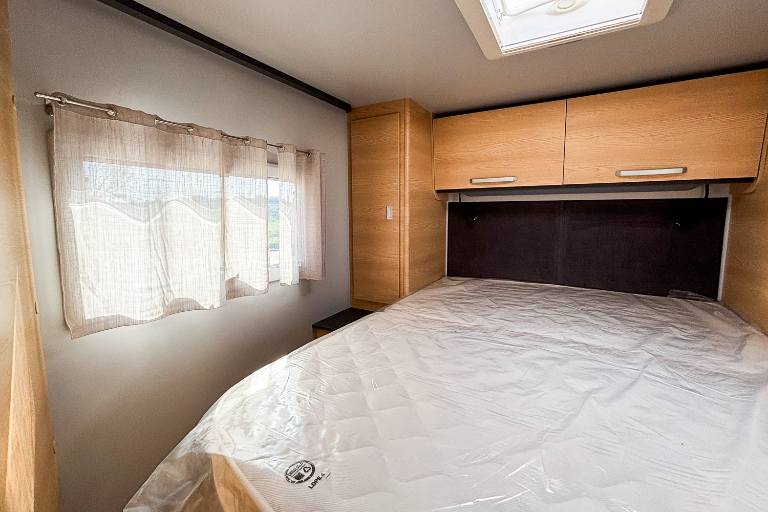 Su distribución se caracteriza principalmente por disponer de amplia cama isla en la parte posterior, fácilmente accesible desde ambos laterales. Dispone de numerosos espacios de almacenamiento tanto en la parte superior como en la parte inferior de la cama, así como roperos laterales y espacios en el suelo.