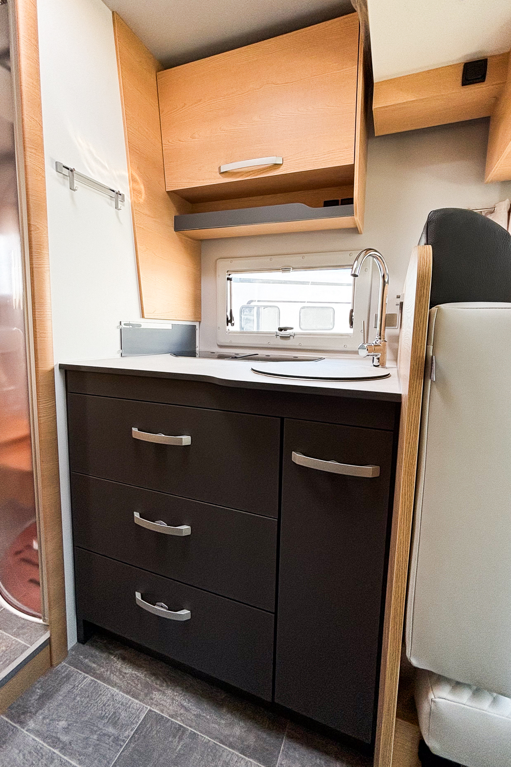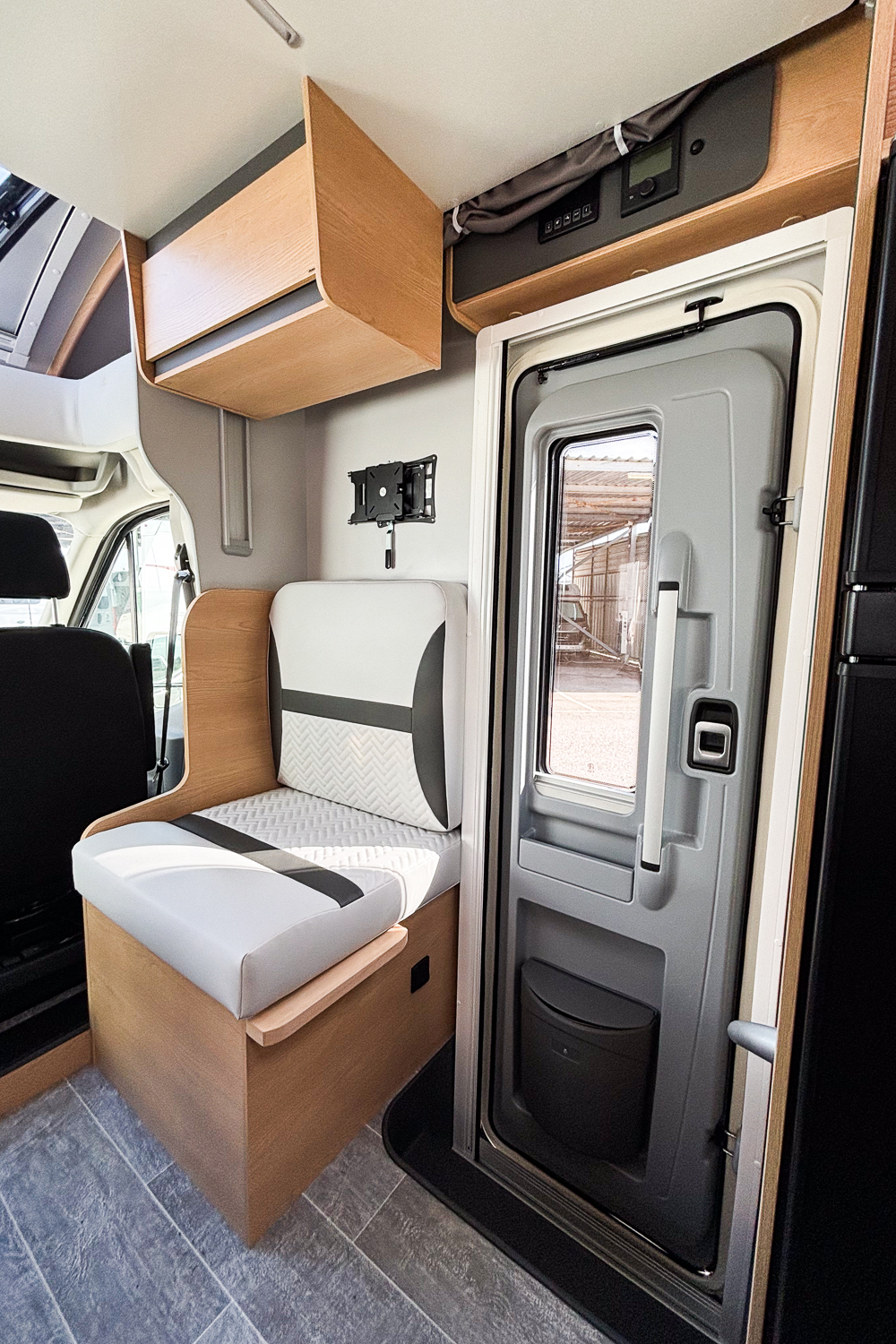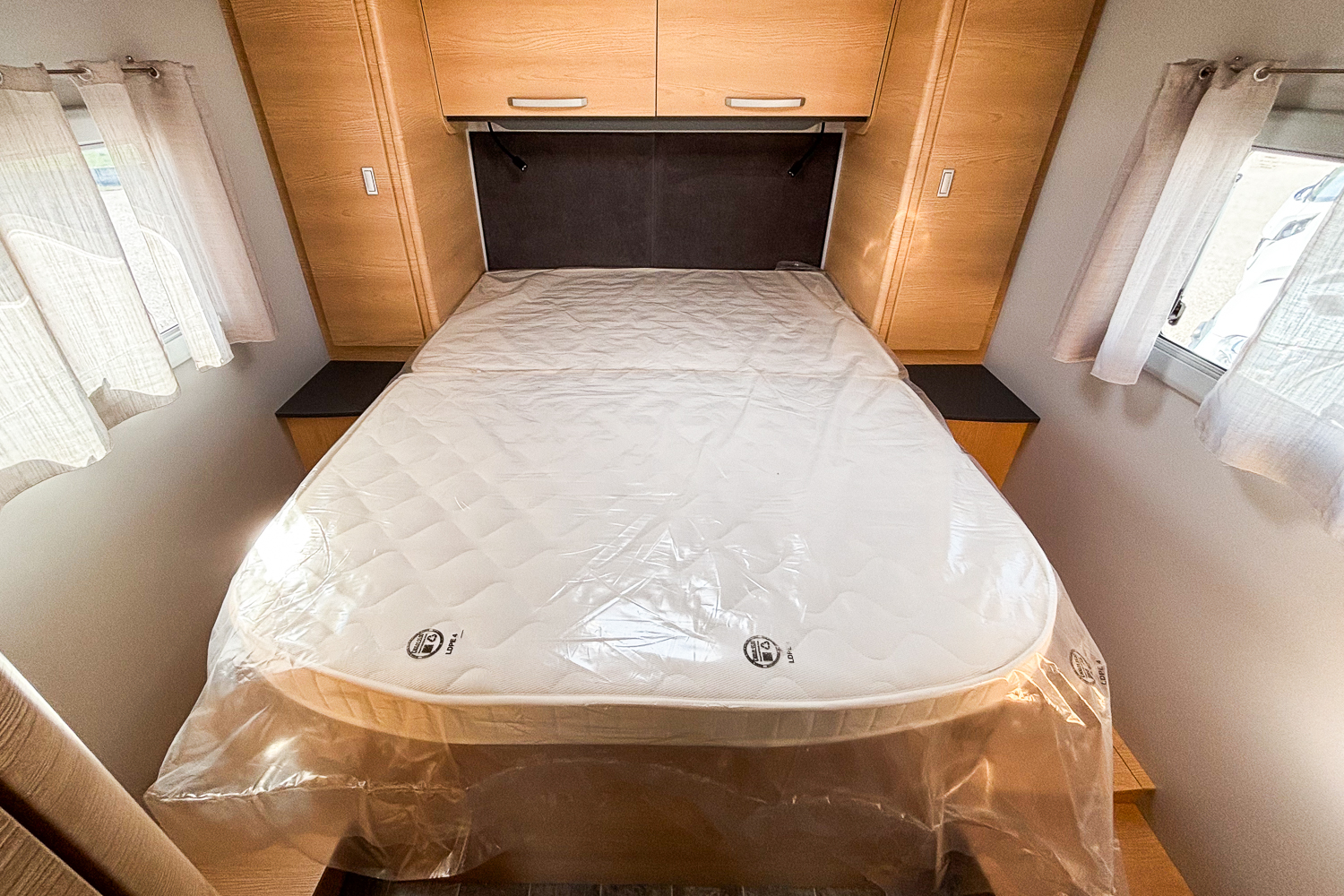 Su distribución se caracteriza principalmente por disponer de amplia cama isla en la parte posterior, fácilmente accesible desde ambos laterales. Dispone de numerosos espacios de almacenamiento tanto en la parte superior como en la parte inferior de la cama, así como roperos laterales y espacios en el suelo.