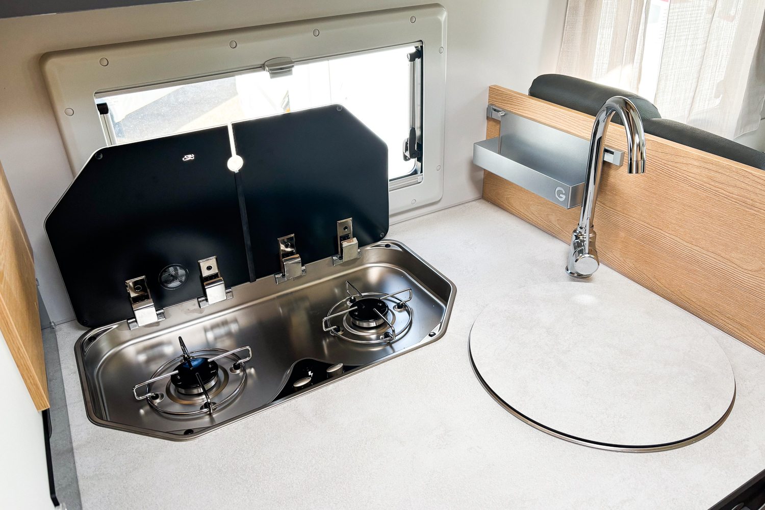 La parte central del vehículo está ocupada por la cocina, equipada con dos fuegos, fregadero y frigorífico grande.