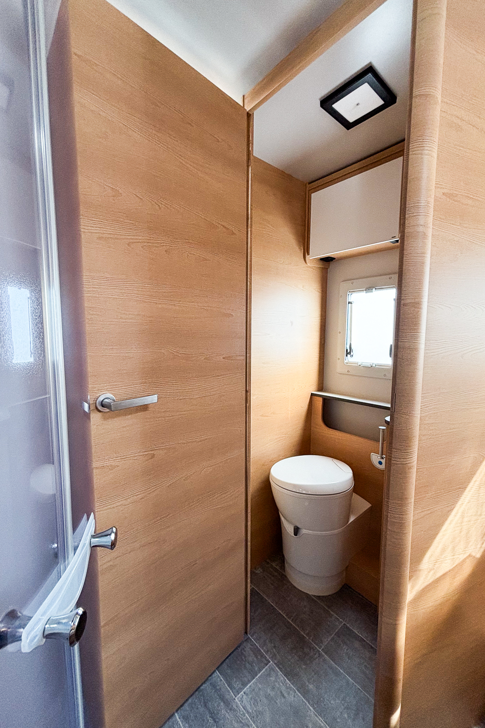El baño está equipado con W.C, lavamanos, ducha y varios espacios de almacenamiento para nuestro equipaje.