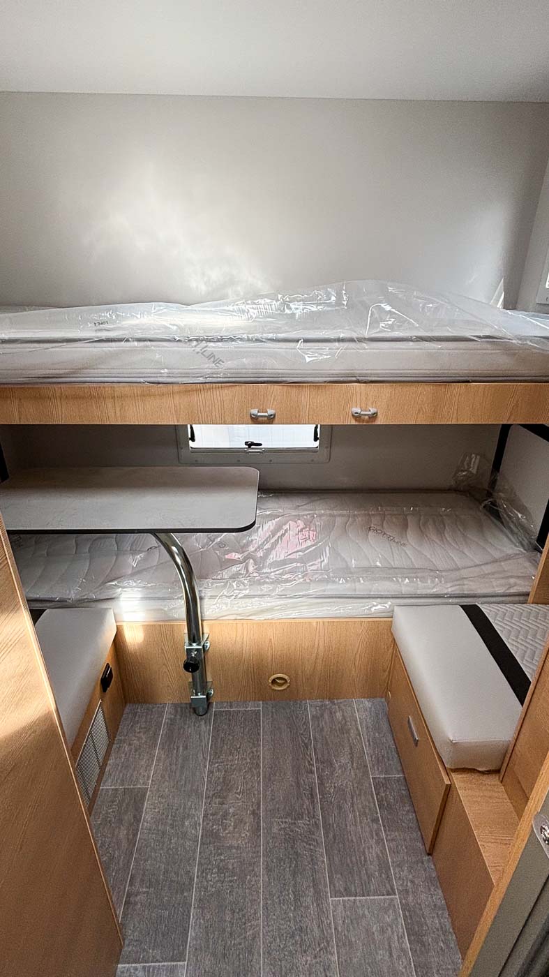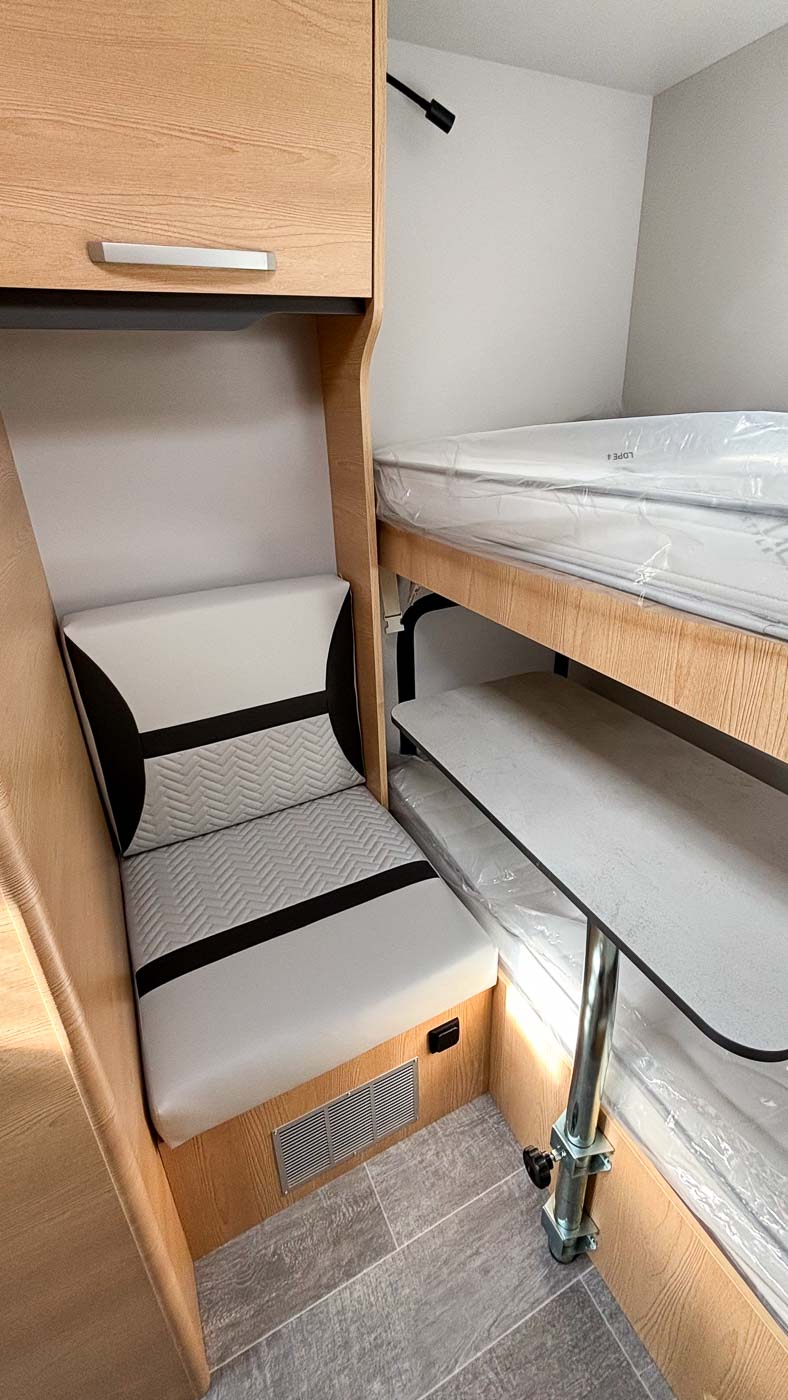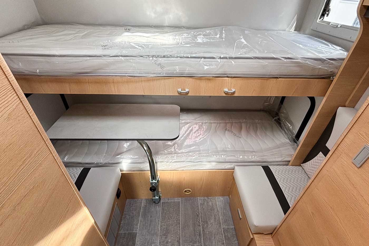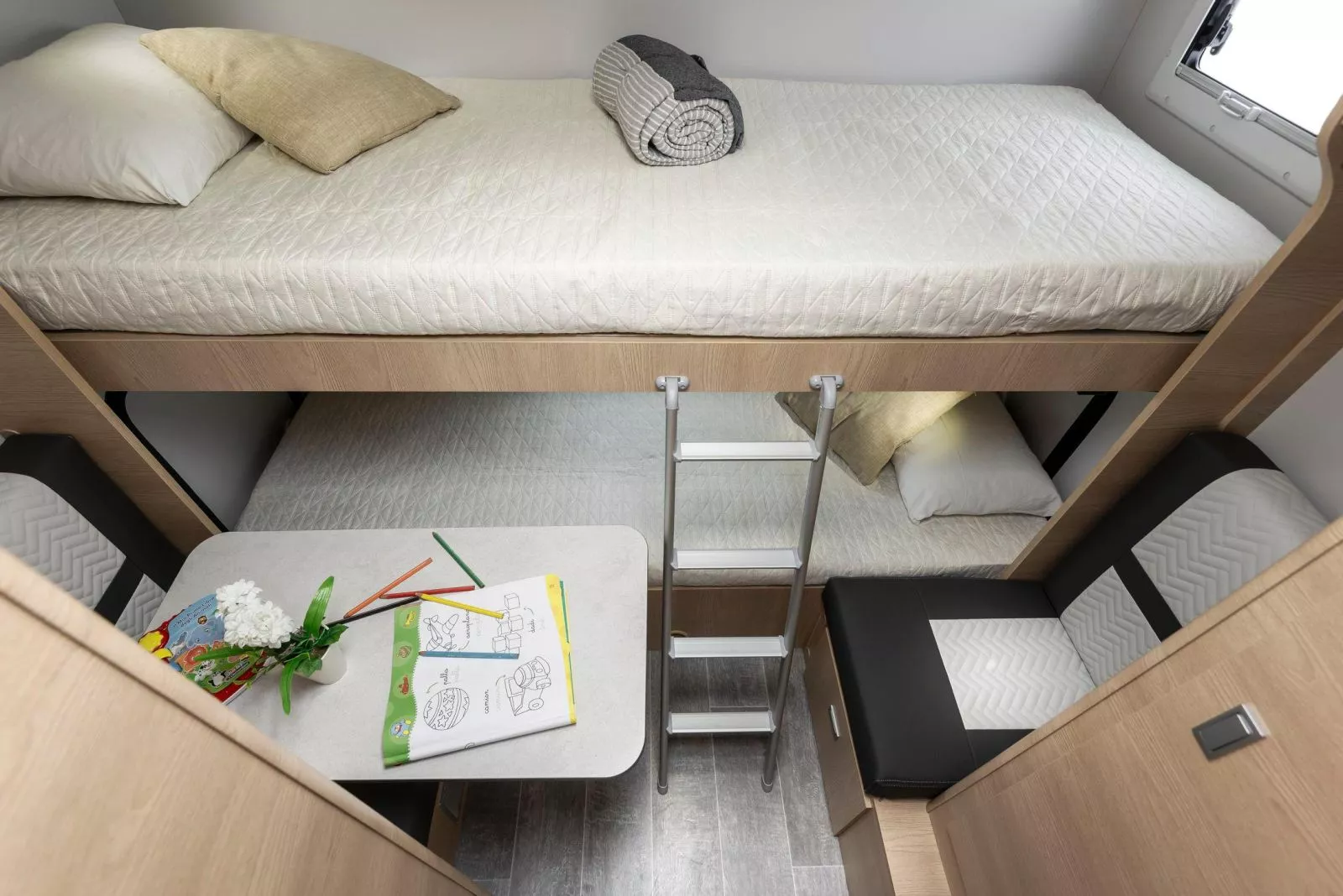 Su distribución se caracteriza principalmente por disponer de camas literas en la parte posterior, cuyas camas podemos disponer en función de nuestras necesidades: ambas camas montadas, sólo la superior para aprovechar el espacio inferior como garaje de carga, o sólo la inferior para ampliar la zona como salón secundario. Y es que en la parte trasera encontramos un salón auxiliar que permitirá a los más pequeños tener su propio espacio para disfrutar durante las estancias.