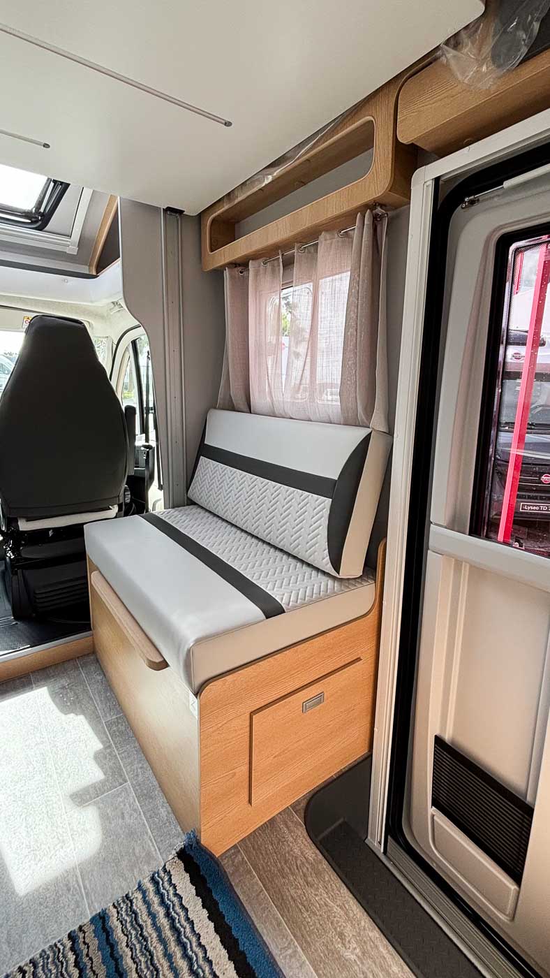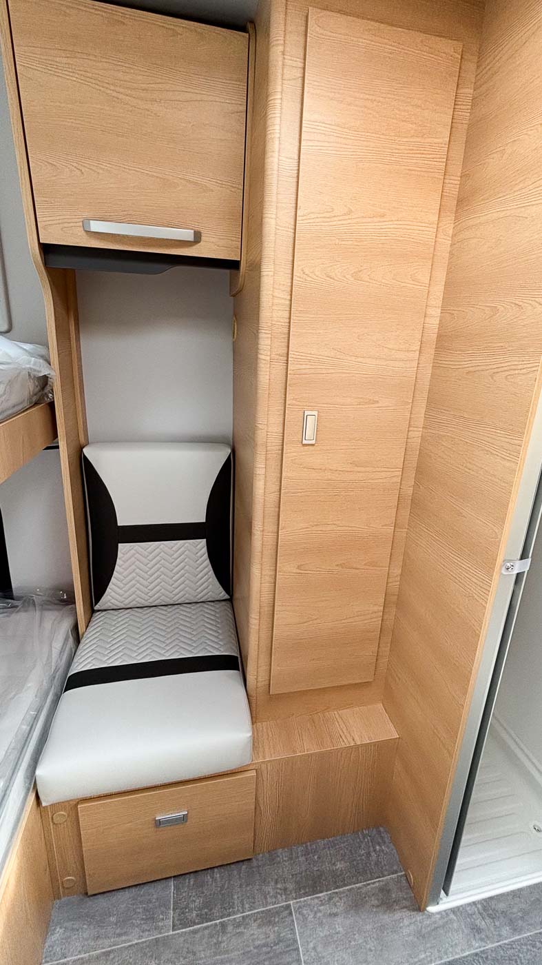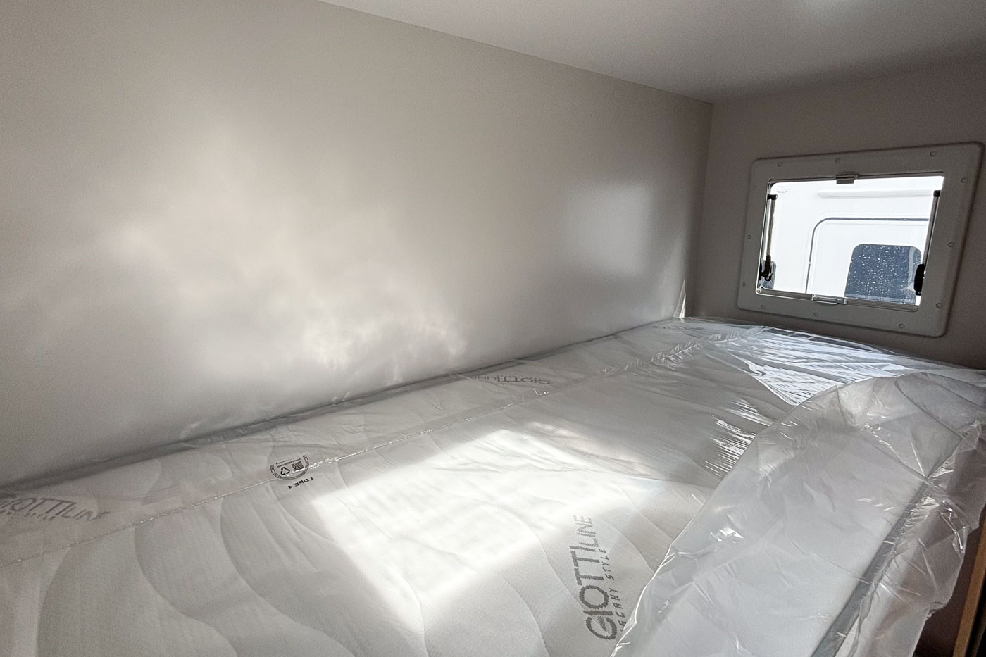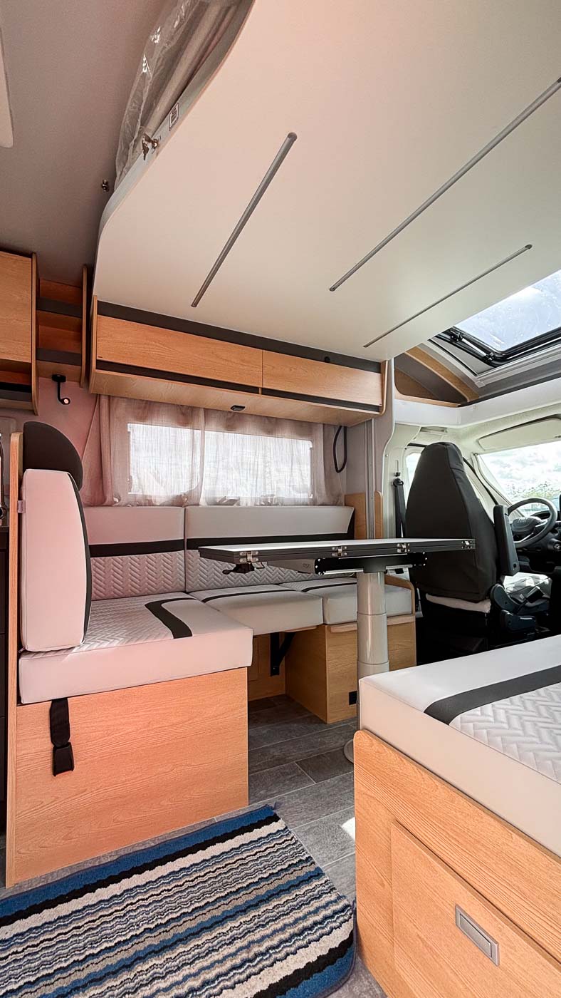 Su distribución se caracteriza principalmente por disponer de camas literas en la parte posterior, cuyas camas podemos disponer en función de nuestras necesidades: ambas camas montadas, sólo la superior para aprovechar el espacio inferior como garaje de carga, o sólo la inferior para ampliar la zona como salón secundario. Y es que en la parte trasera encontramos un salón auxiliar que permitirá a los más pequeños tener su propio espacio para disfrutar durante las estancias.