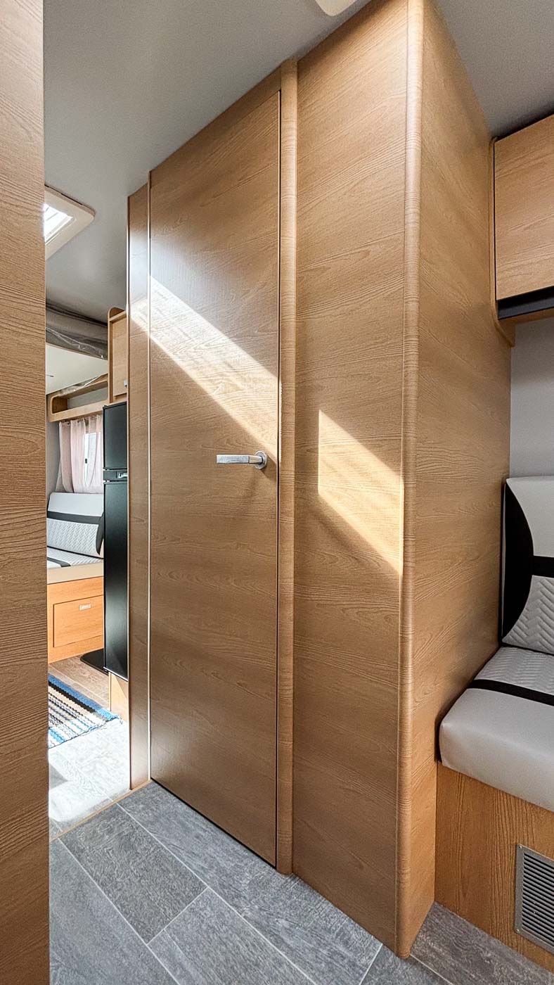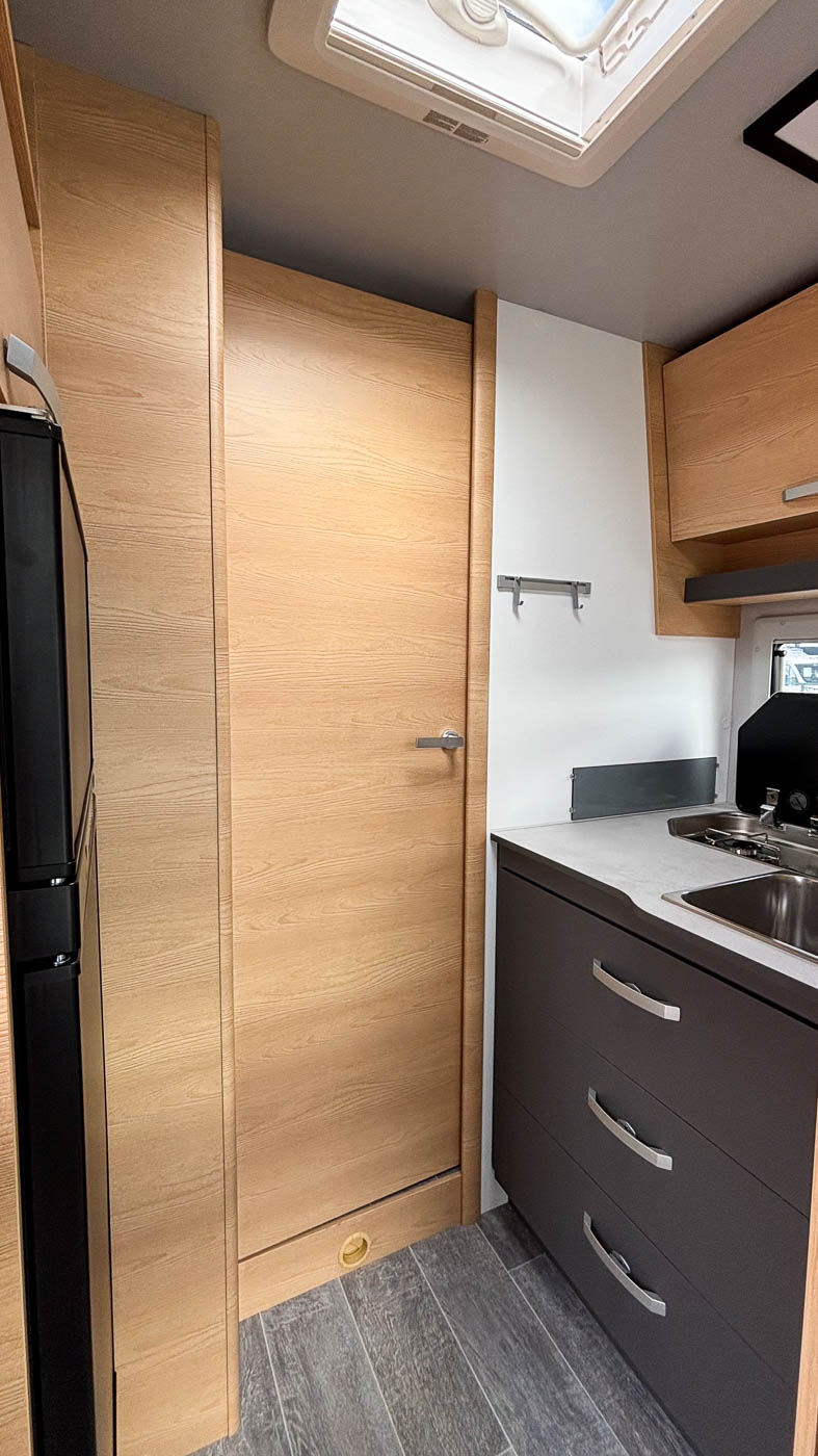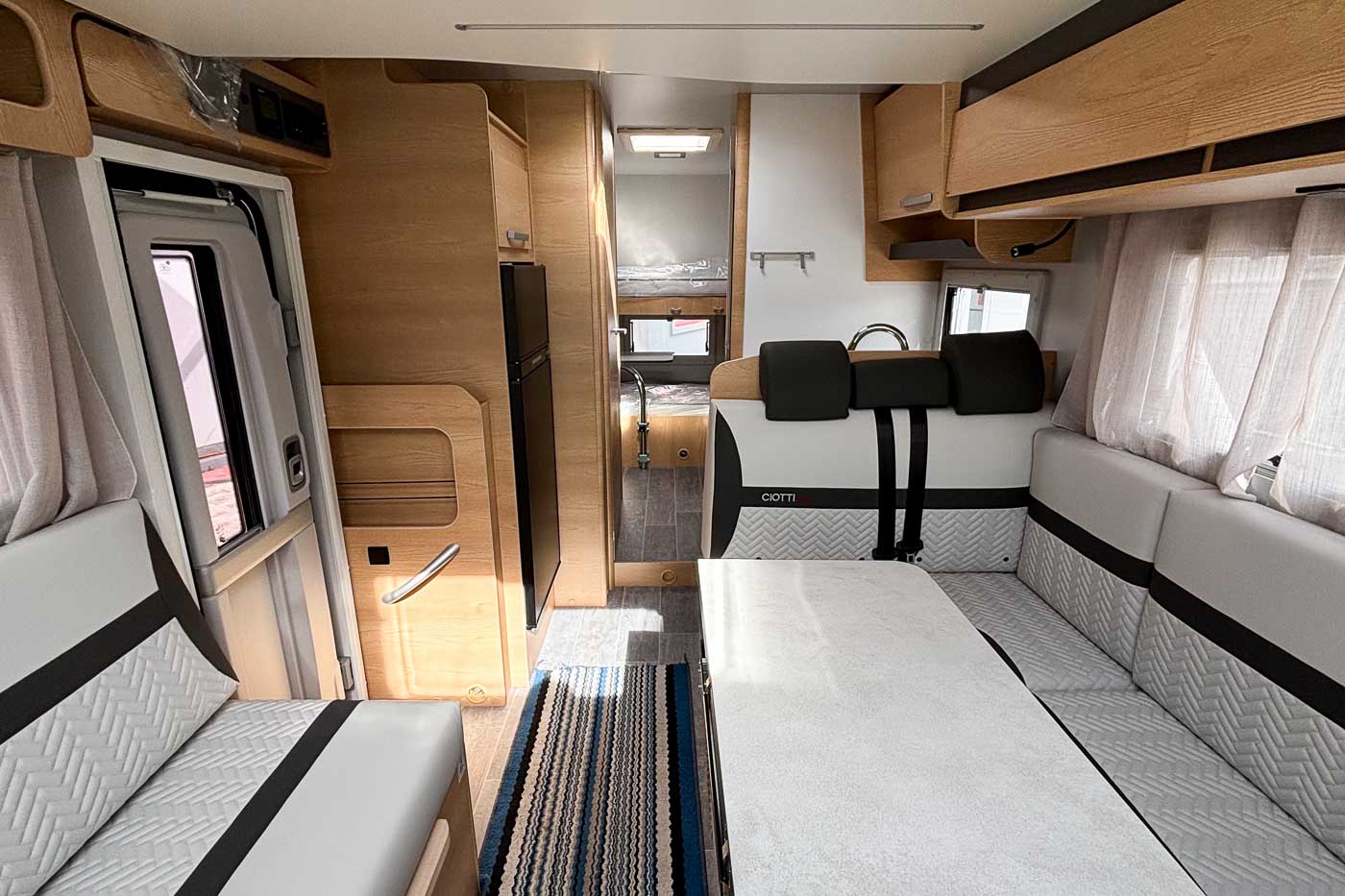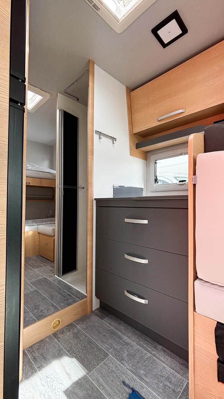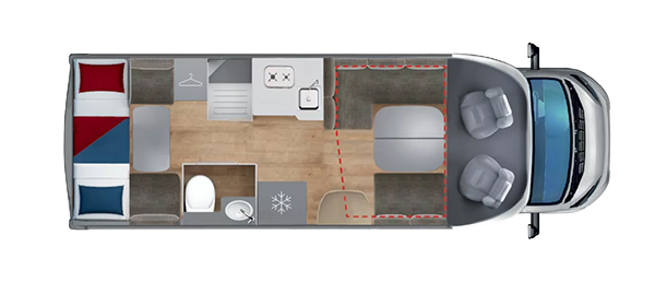 Su distribución se caracteriza principalmente por disponer de camas literas en la parte posterior, cuyas camas podemos disponer en función de nuestras necesidades: ambas camas montadas, sólo la superior para aprovechar el espacio inferior como garaje de carga, o sólo la inferior para ampliar la zona como salón secundario. Y es que en la parte trasera encontramos un salón auxiliar que permitirá a los más pequeños tener su propio espacio para disfrutar durante las estancias.