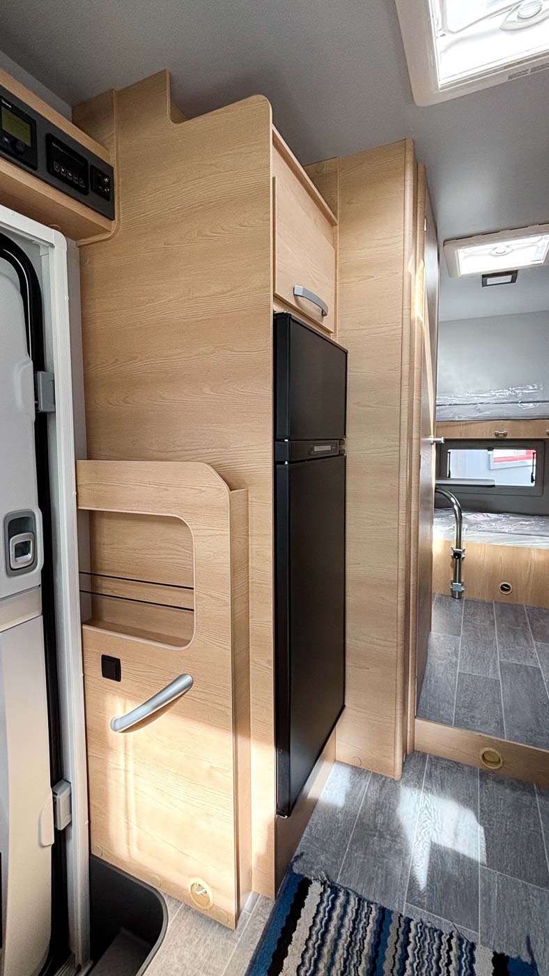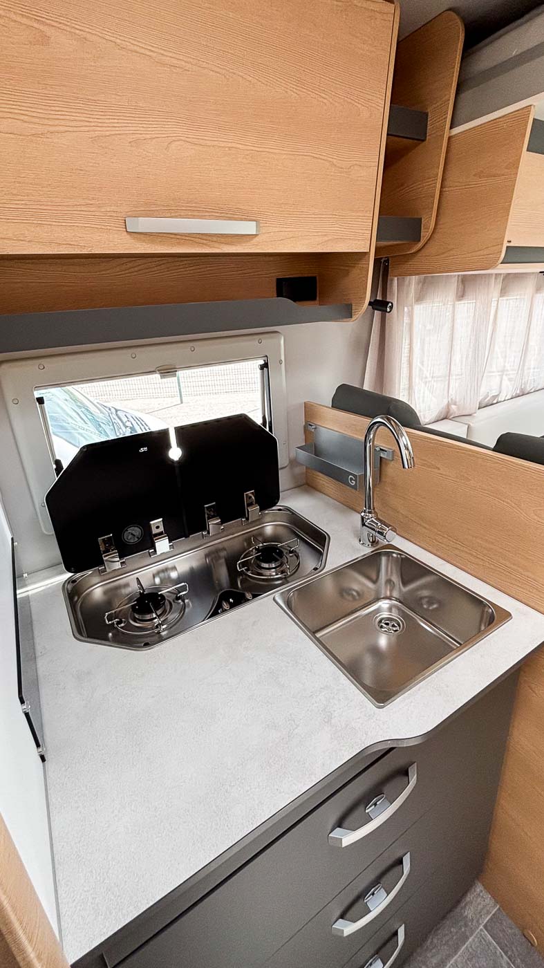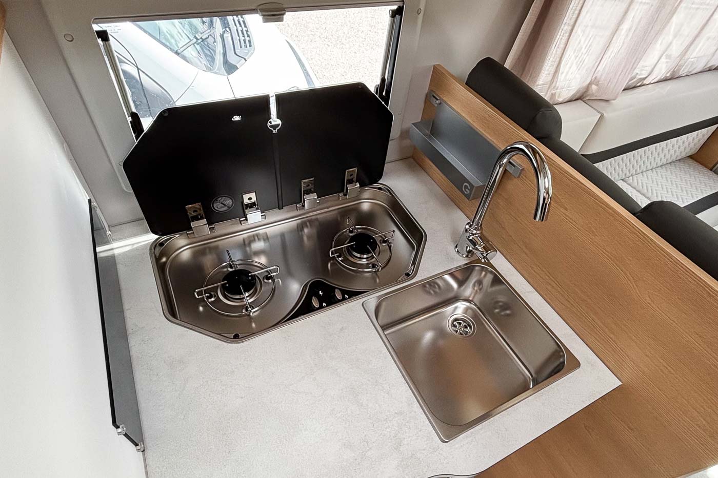 La parte central del vehículo está ocupada por la cocina, equipada con dos fuegos, fregadero y frigorífico grande.