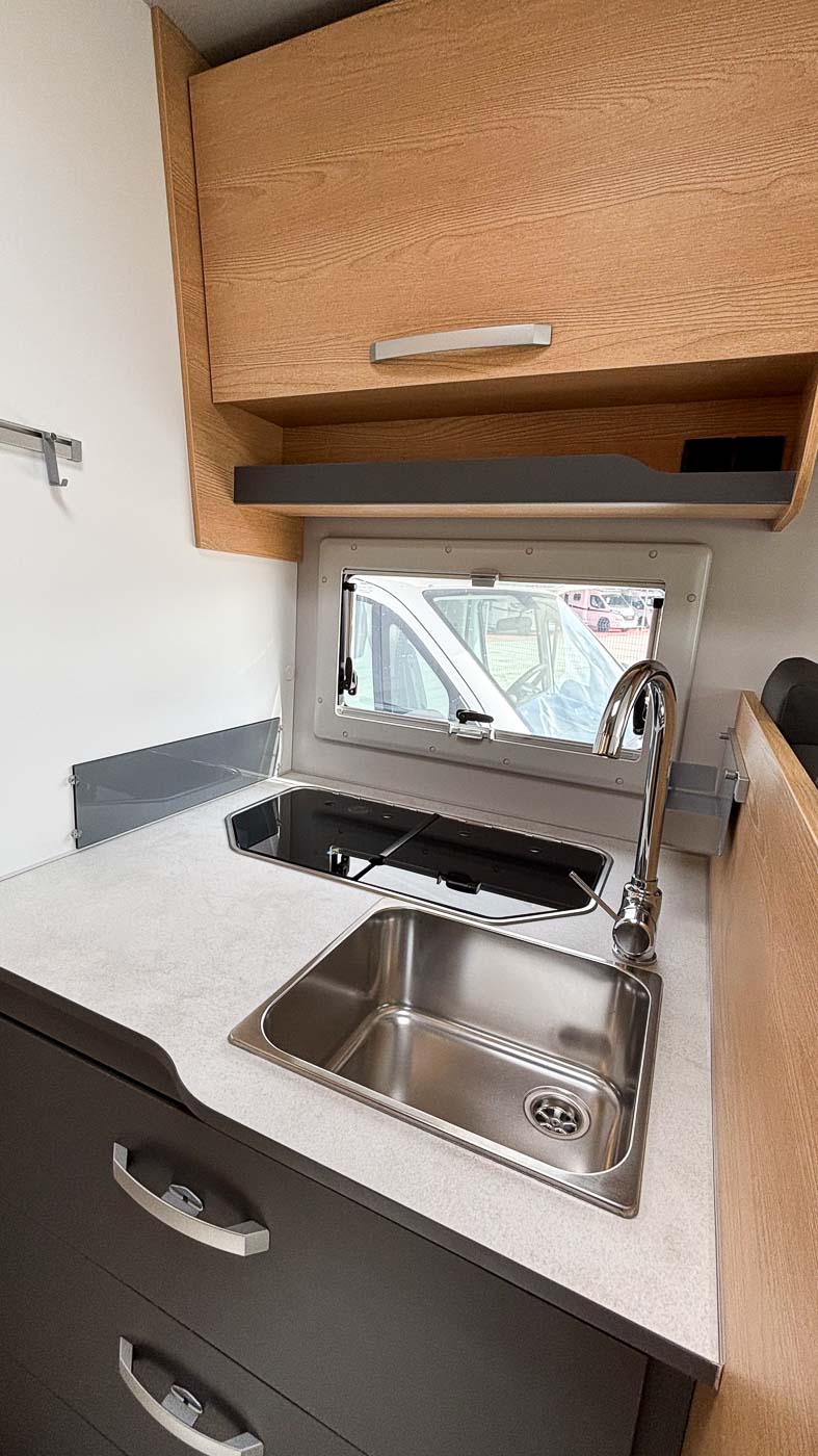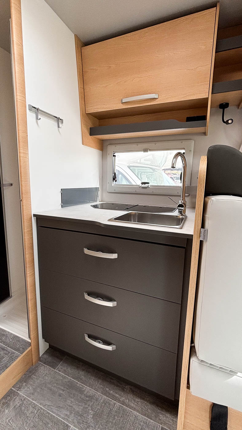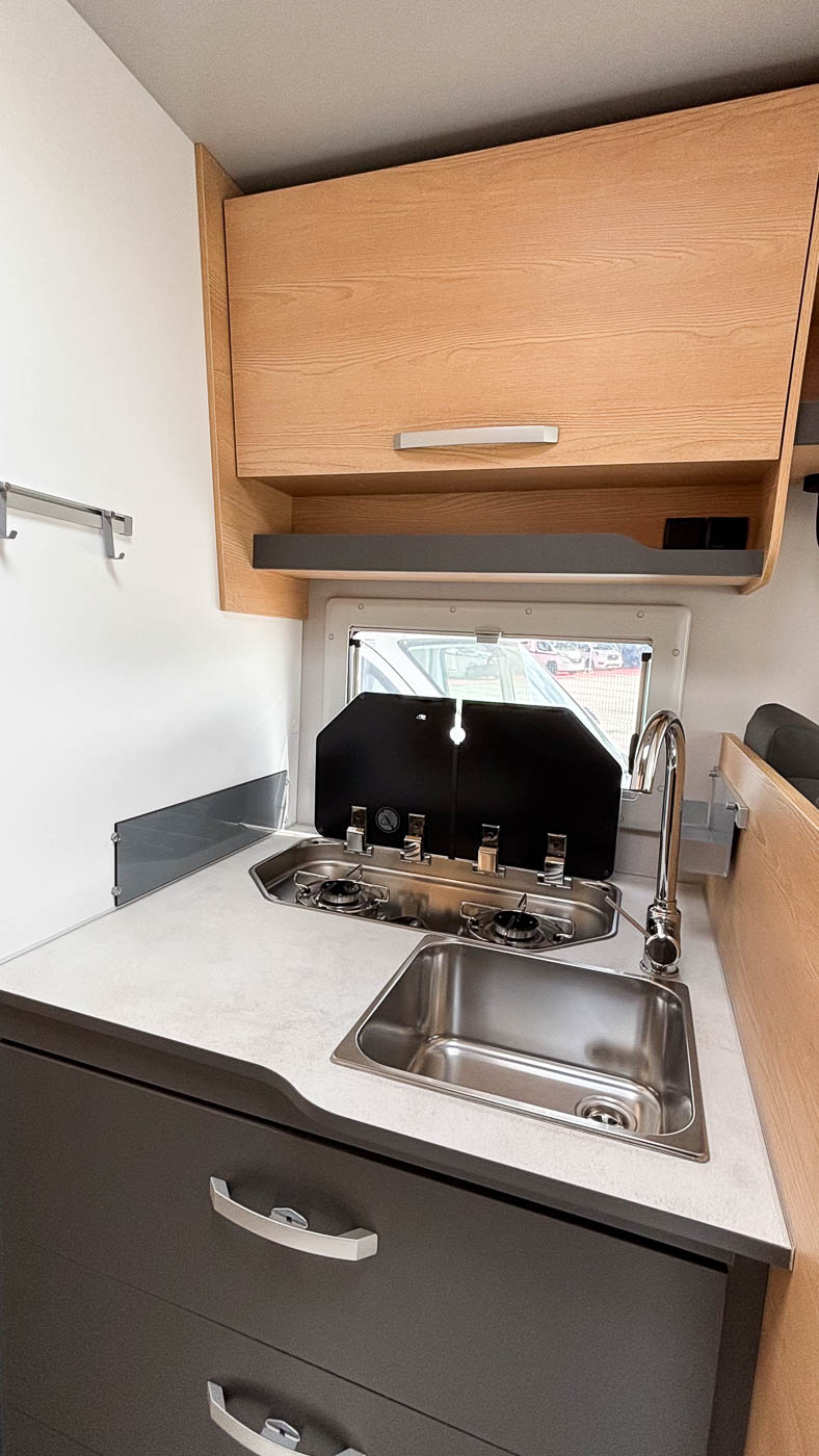 La parte central del vehículo está ocupada por la cocina, equipada con dos fuegos, fregadero y frigorífico grande.
