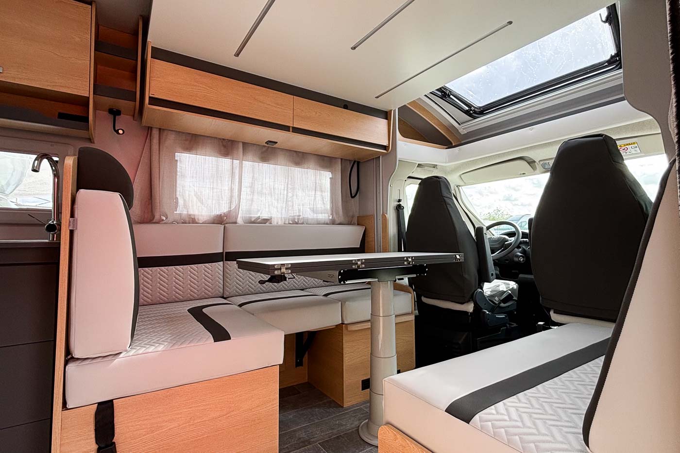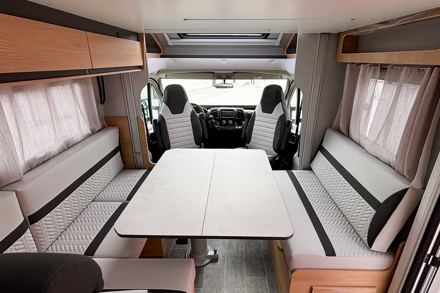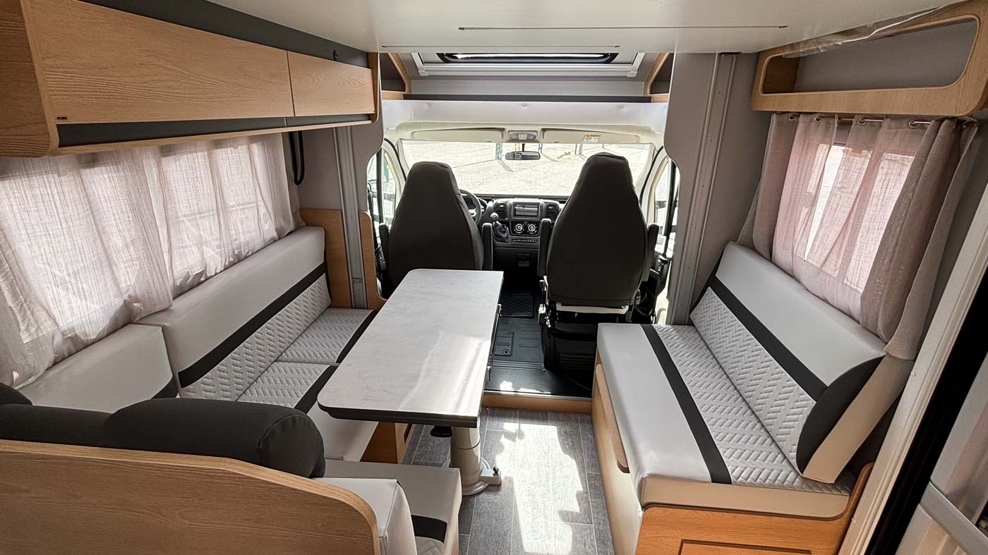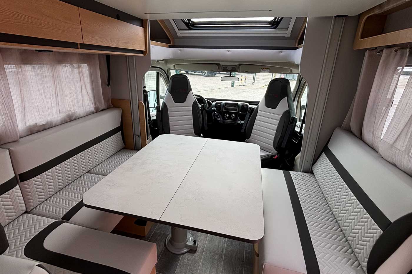 Cuenta con gran salón face to face en el que compartir los mejores momentos en familia. Dispone de gran mesa plegable tipo libro, permitiendo disfrutar de un cómodo espacio gracias a los asientos giratorios de la cabina y los sofás enfrentados. Esta zona puede transformarse además en cama individual.