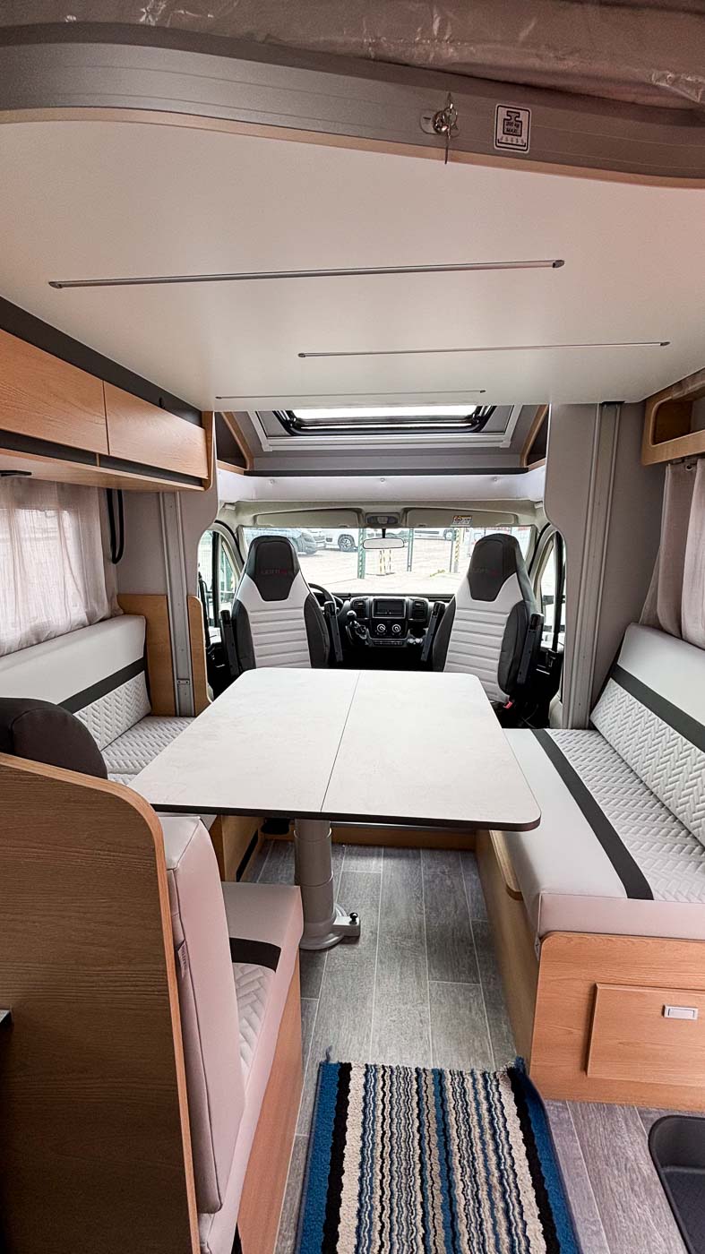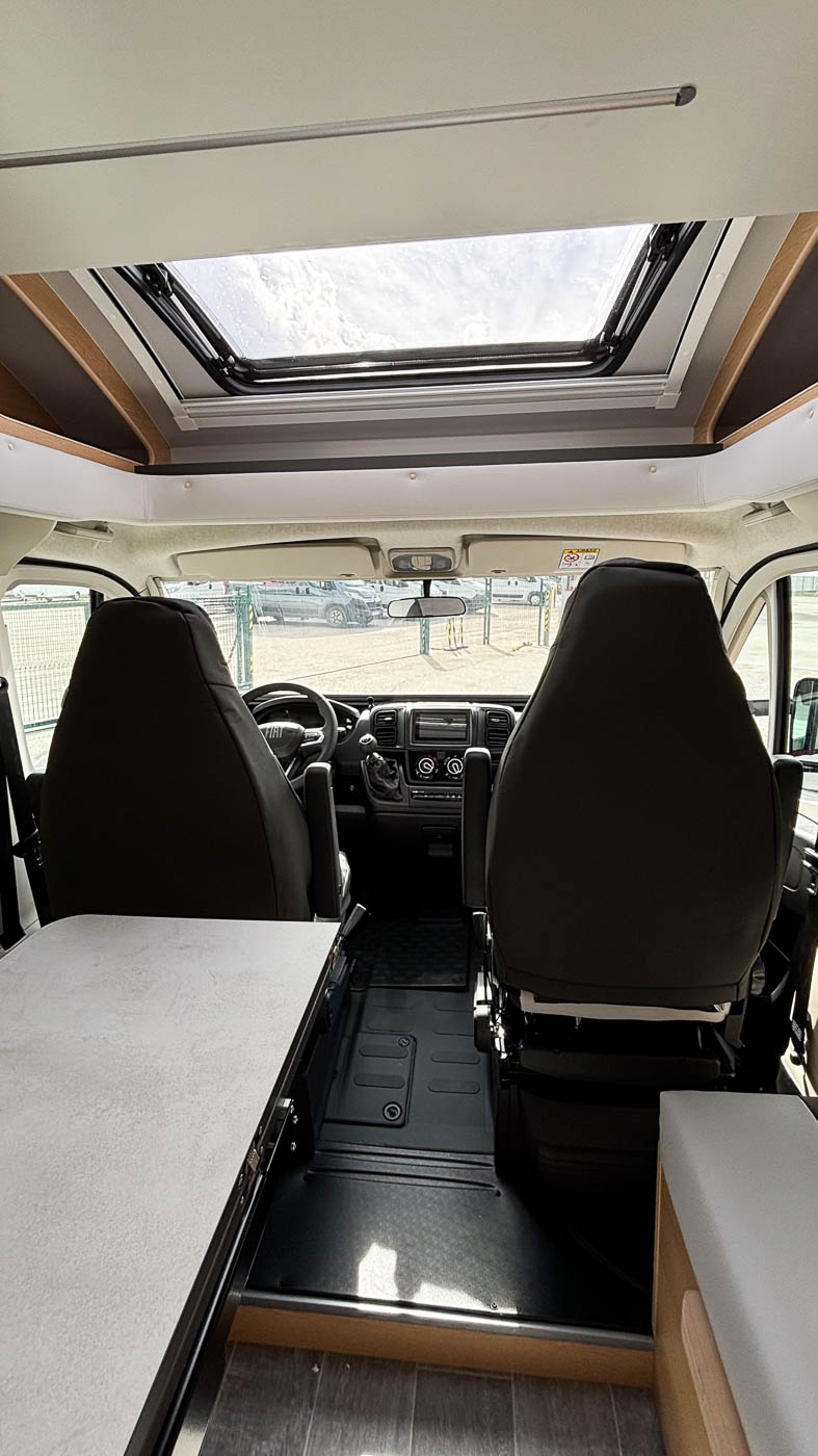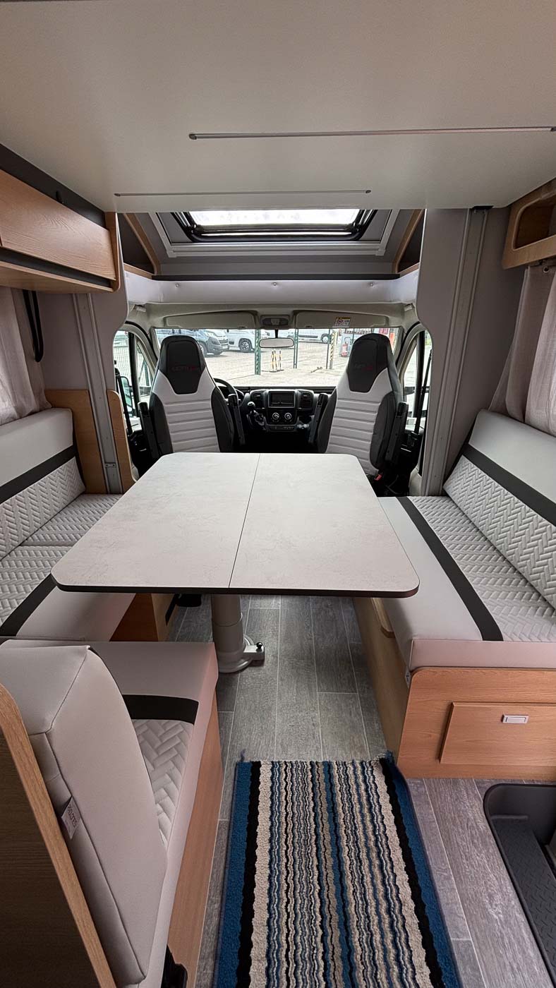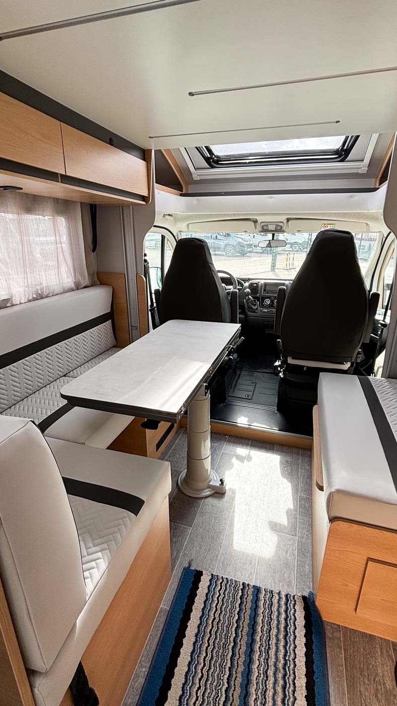 Cuenta con gran salón face to face en el que compartir los mejores momentos en familia. Dispone de gran mesa plegable tipo libro, permitiendo disfrutar de un cómodo espacio gracias a los asientos giratorios de la cabina y los sofás enfrentados. Esta zona puede transformarse además en cama individual.