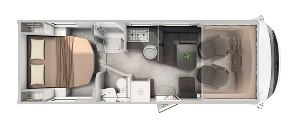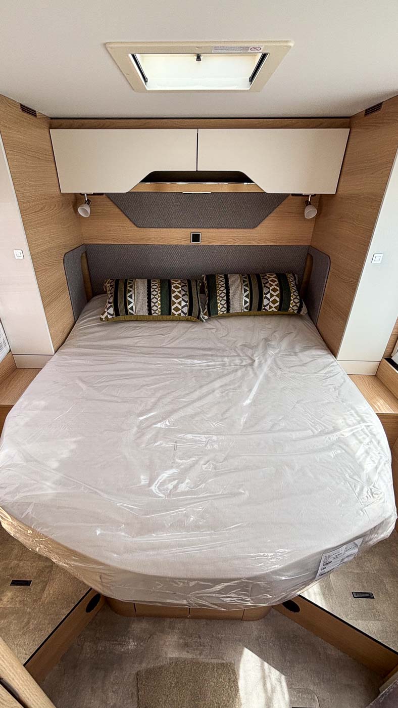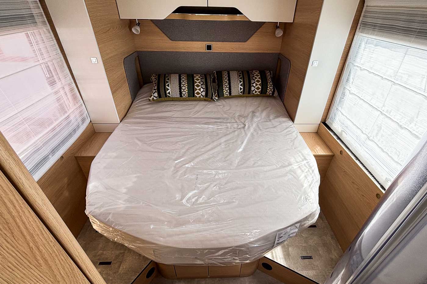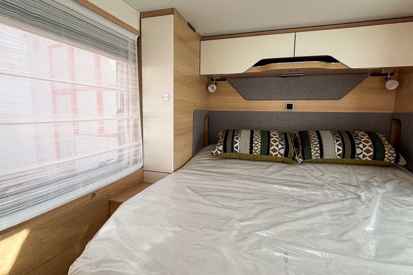 Esta Hymer B MC I 690 es una autocaravana integral para cuatro personas. Dispone de amplia cama isla en la parte trasera, fácilmente accesible desde ambos laterales, con numerosos espacios de almacenamiento para organizar nuestro equipaje, tanto en la parte superior como en la parte inferior de la cama. Esta cama es regulable en altura.