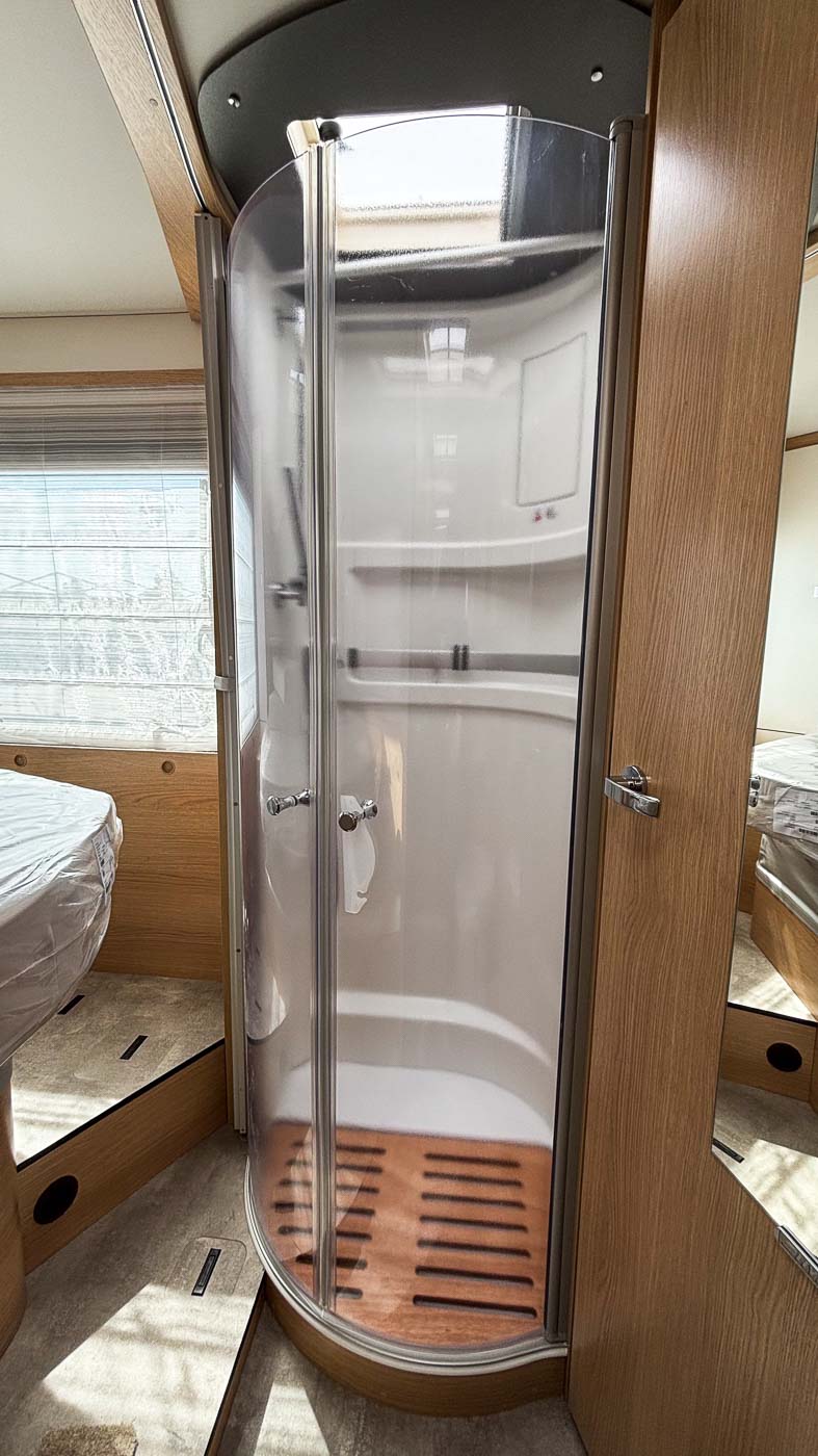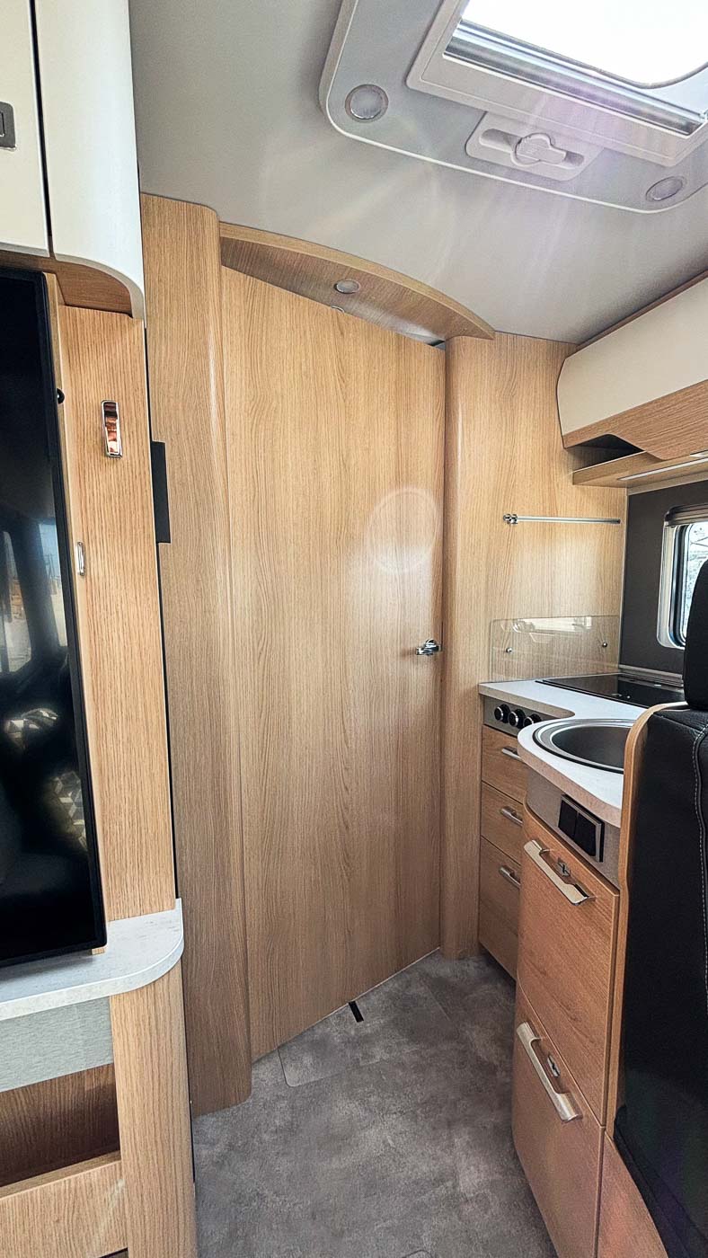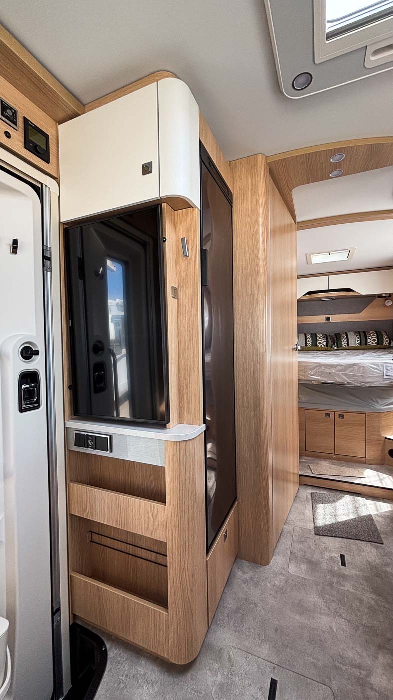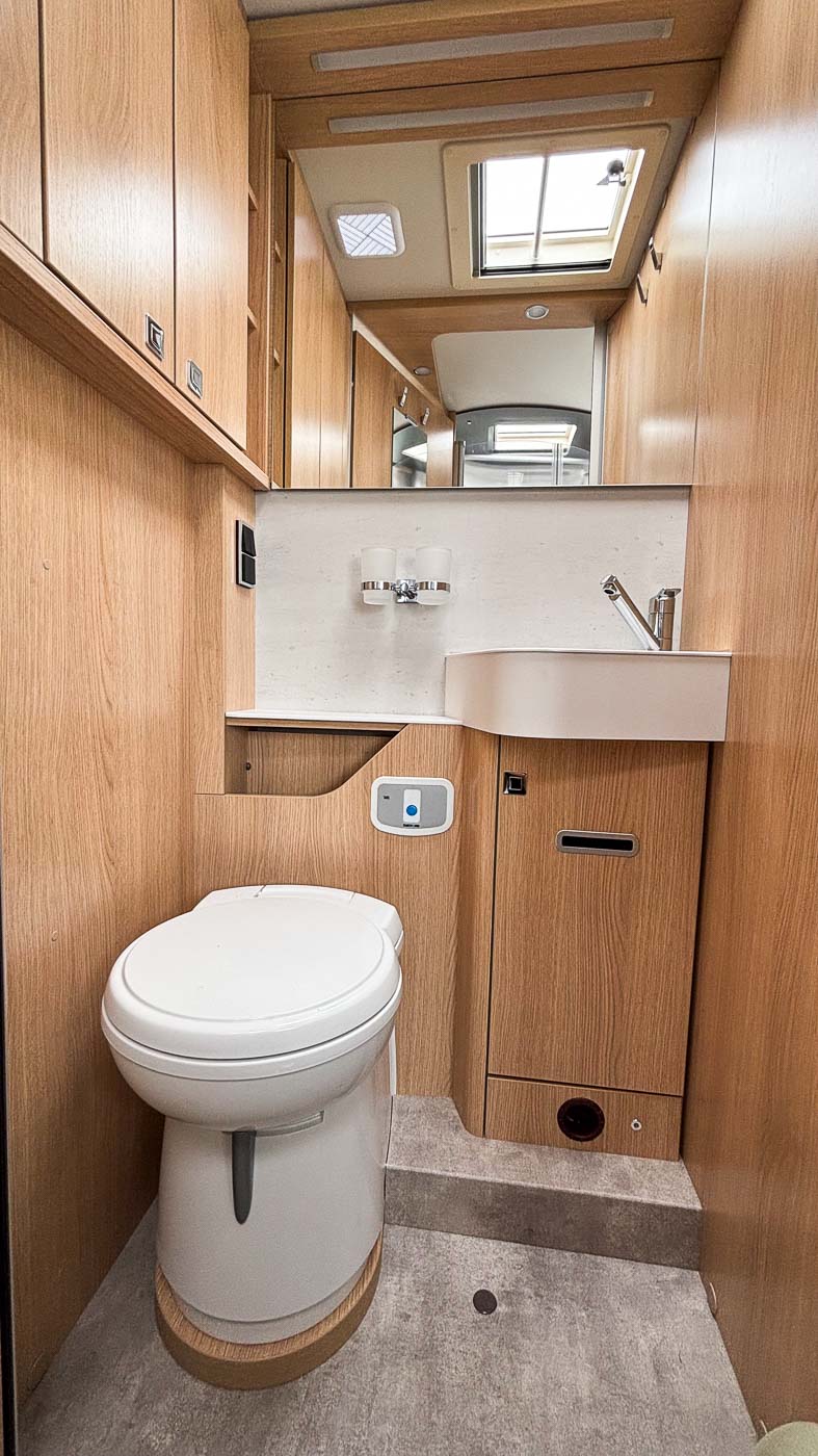 Esta Hymer B MC I 690 es una autocaravana integral para cuatro personas. Dispone de amplia cama isla en la parte trasera, fácilmente accesible desde ambos laterales, con numerosos espacios de almacenamiento para organizar nuestro equipaje, tanto en la parte superior como en la parte inferior de la cama. Esta cama es regulable en altura.