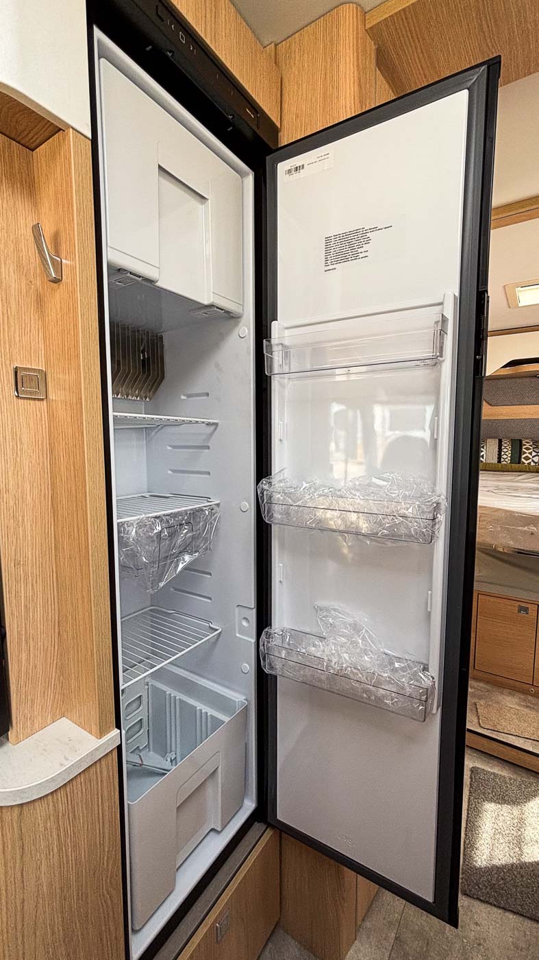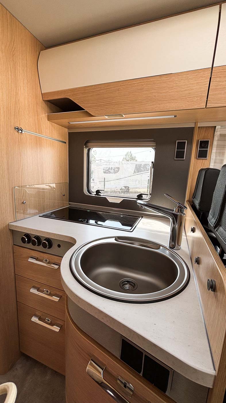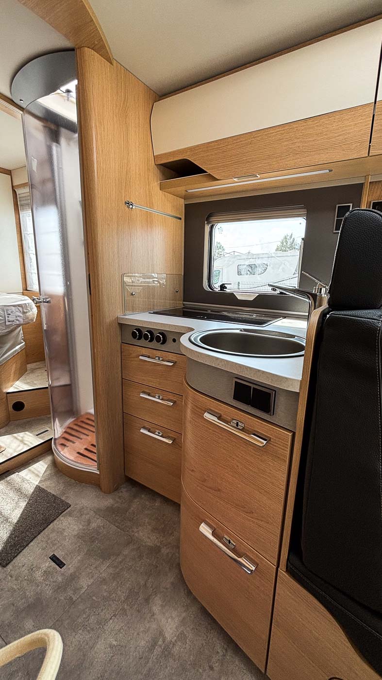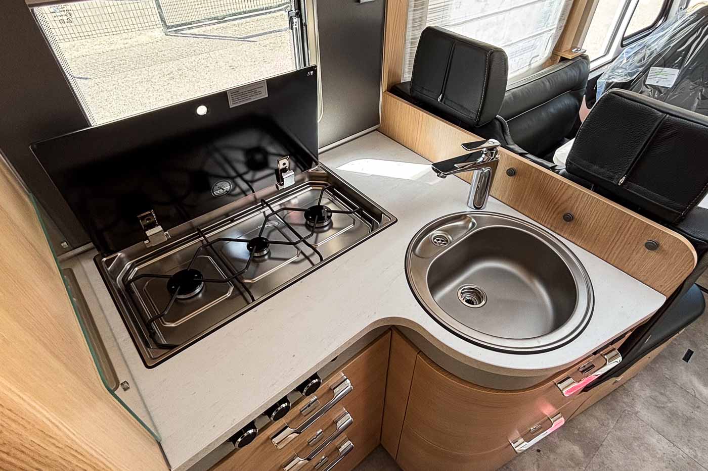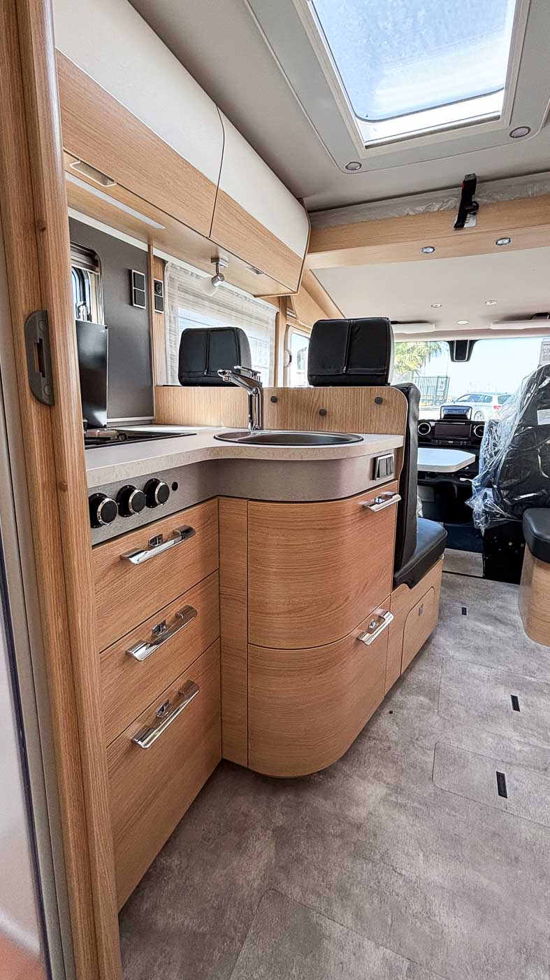 La parte central del vehículo está ocupada por la cocina equipada con tres fuegos, fregadero y frigorífico grande con descongelador. Dispone de numerosos espacios de almacenamiento para alimentación y menaje.