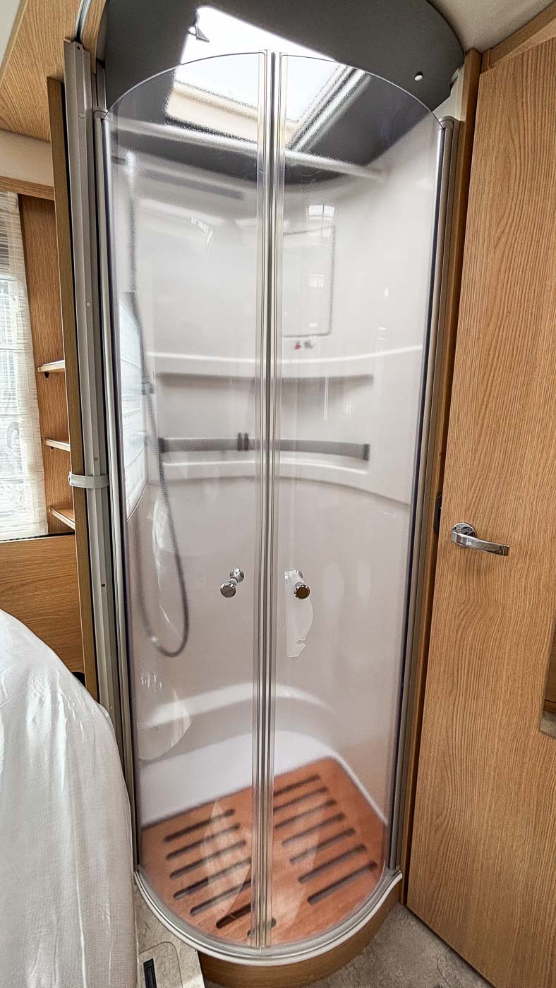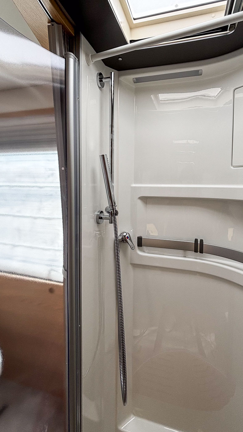 Dispone de amplia zona de baño equipado por un lado con cabina de ducha independiente, y por otro con W.C y lavamanos así como numerosos espacios de almacenamiento.