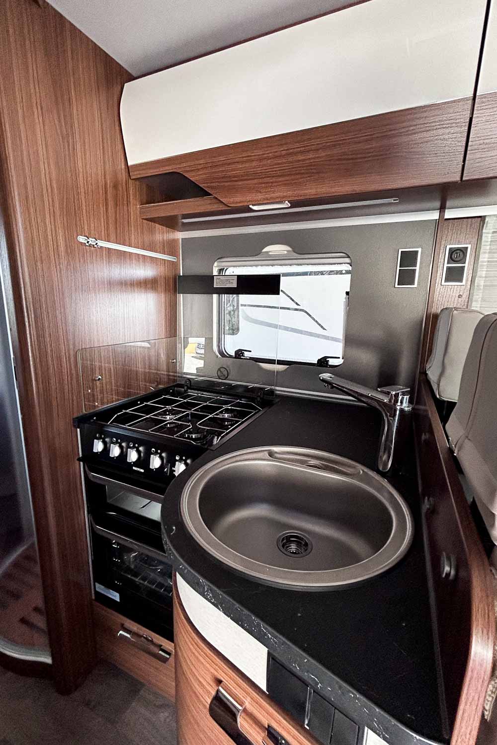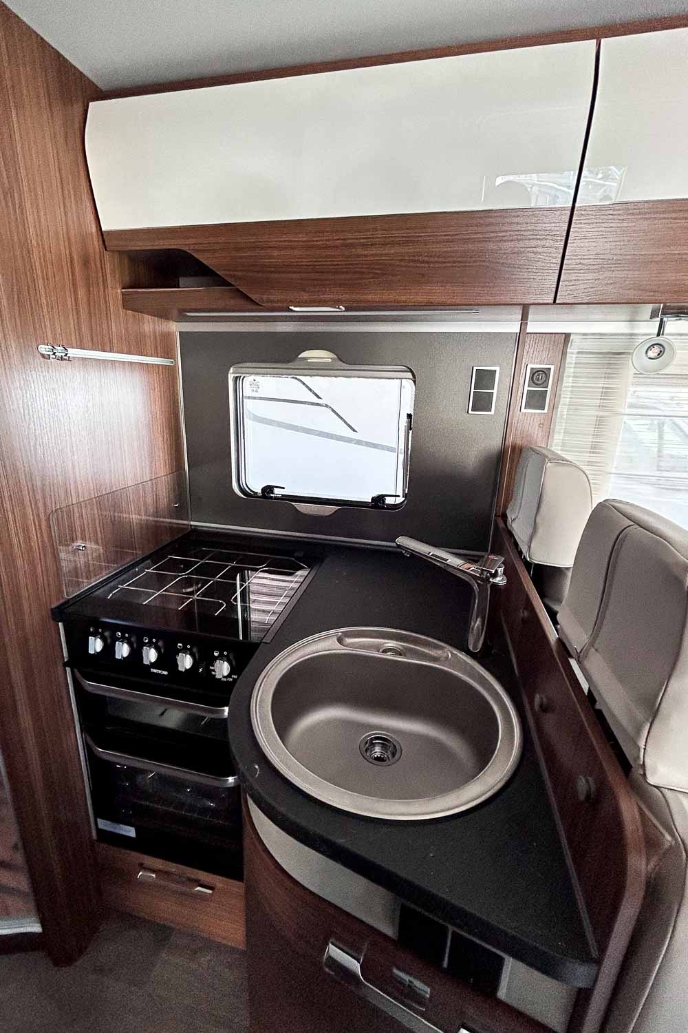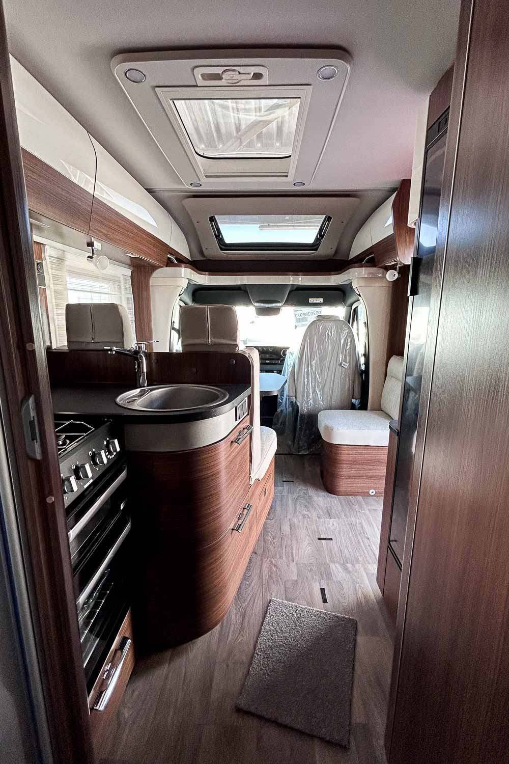 La parte central del vehículo está ocupada por la cocina equipada con tres fuegos, fregadero, horno y frigorífico grande. Dispone de numerosos espacios de almacenamiento para alimentación y menaje.