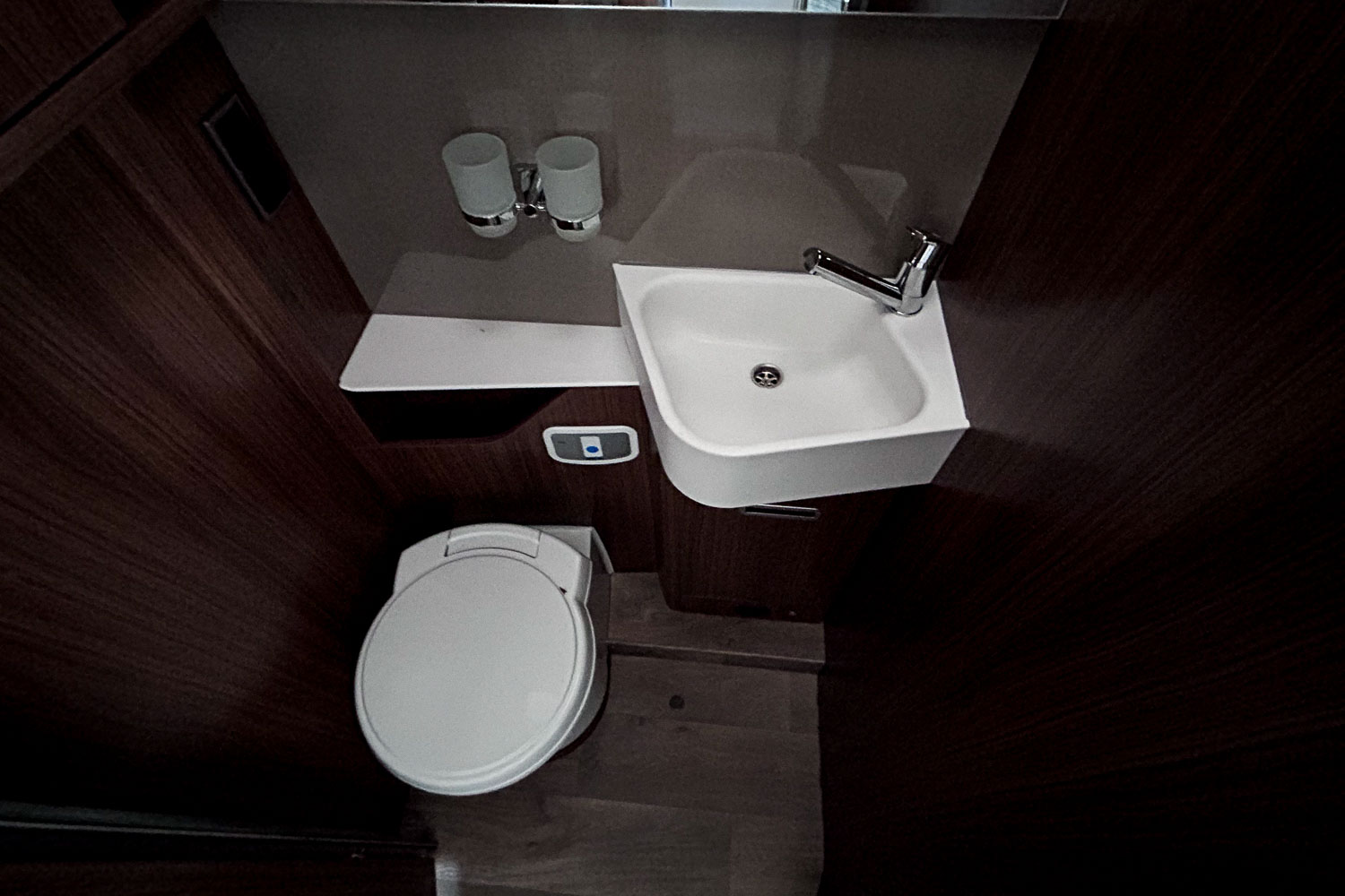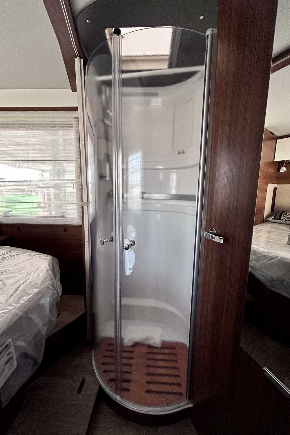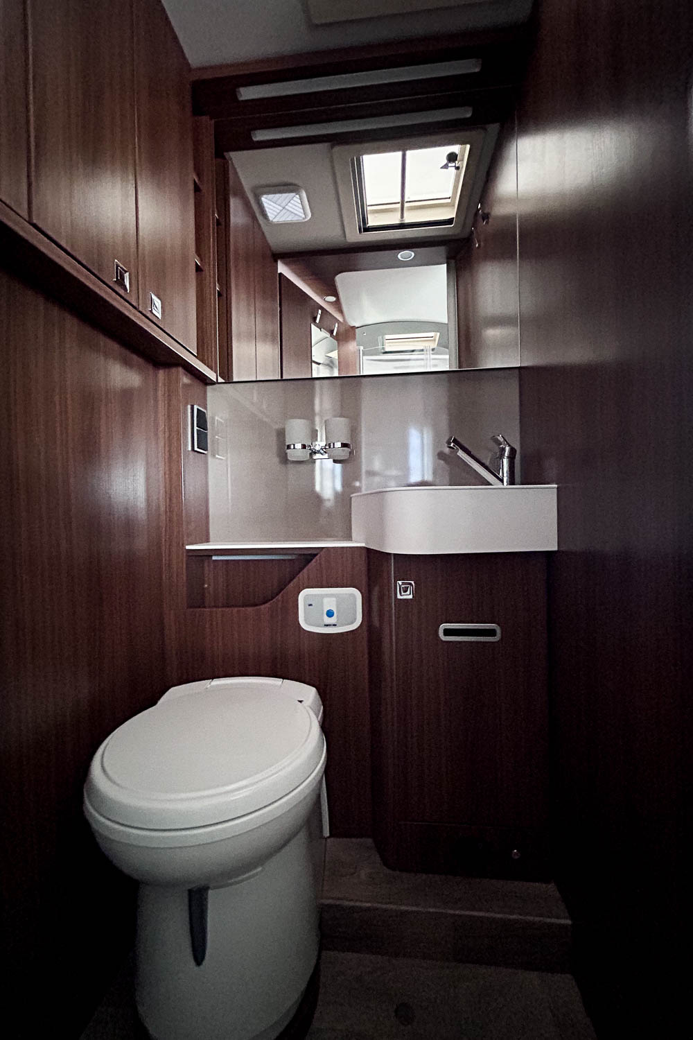 Cuenta con baño equipado con W.C. y lavamanos, así como numerosos espacios de almacenamiento. Frente al baño encontramos la cabina de ducha, independiente y cómoda gracias a las puertas plegables.