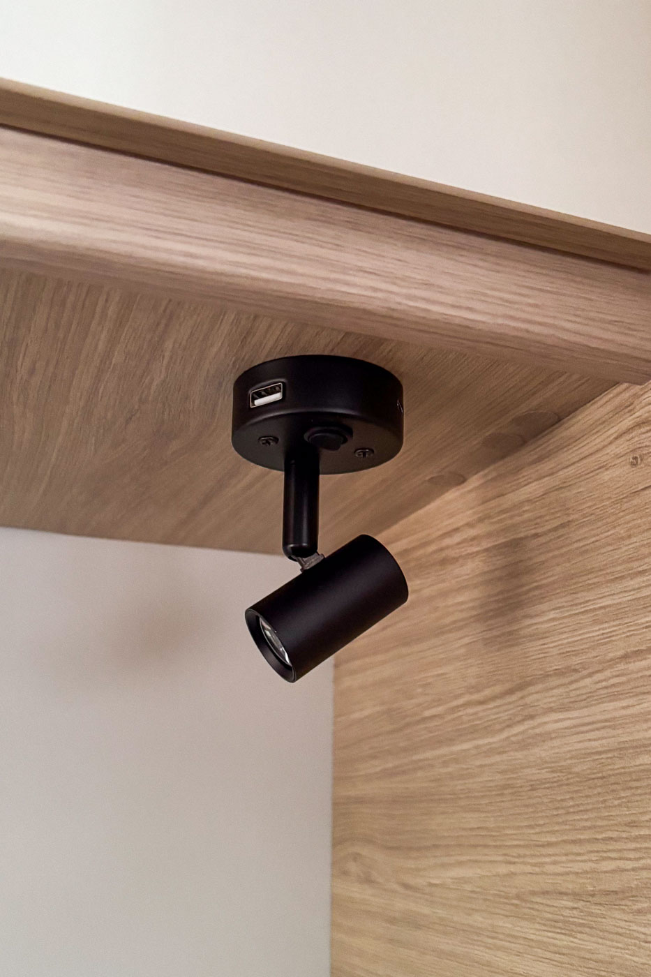 El baño es compacto pero equipado con W.C., lavamanos plegable y ducha extensible, además de plato ducha en el suelo.